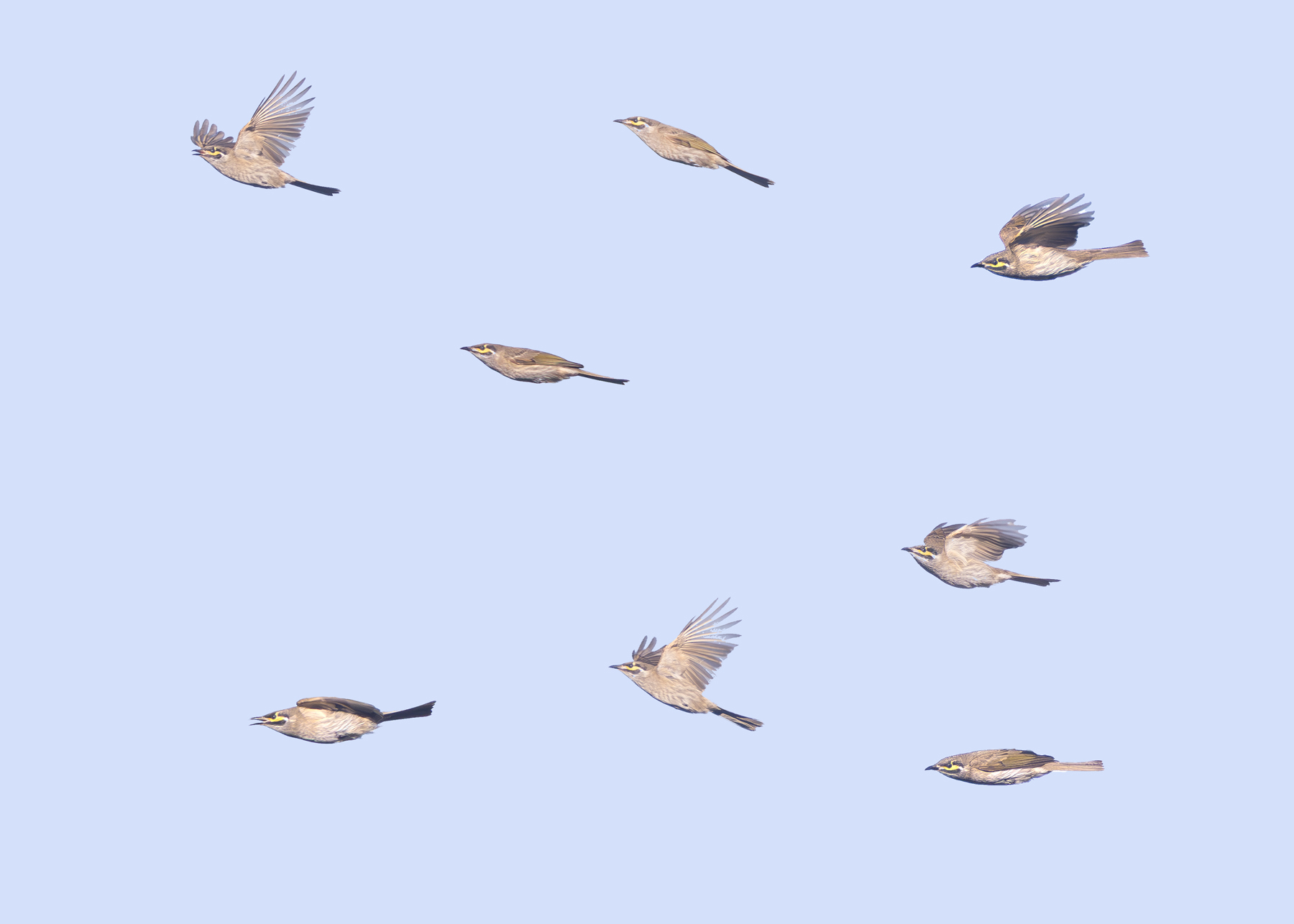 Inflight poses of Yellow-faced Honeyeaters during the 2025 autumn migration from the ranges to the coast - Colin Driscoll.