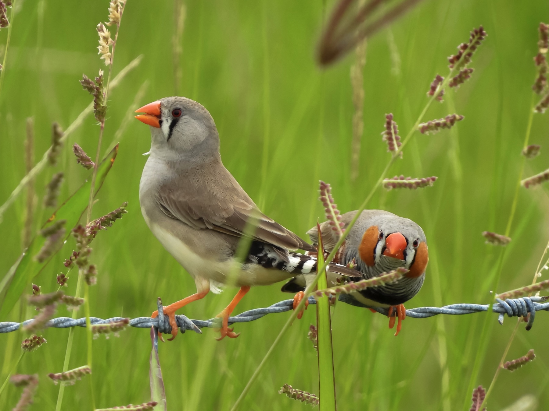 Zebra Finches perching on a fence to reach the grass seedheads in the rain, Jan, 2026, Townsville, Queensland - Audrey Hay.