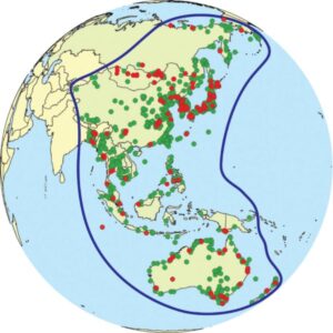 Image: The blue line indicates the extent of the East Asian-Australasian Flyway (EAAF). Green points indicate important sites for migratory waterbirds. Red points show specific sites in the Flyway Site Network through the East Asian-Australasian Flyway Partnership (EAAFP), which Australia is a partner of.