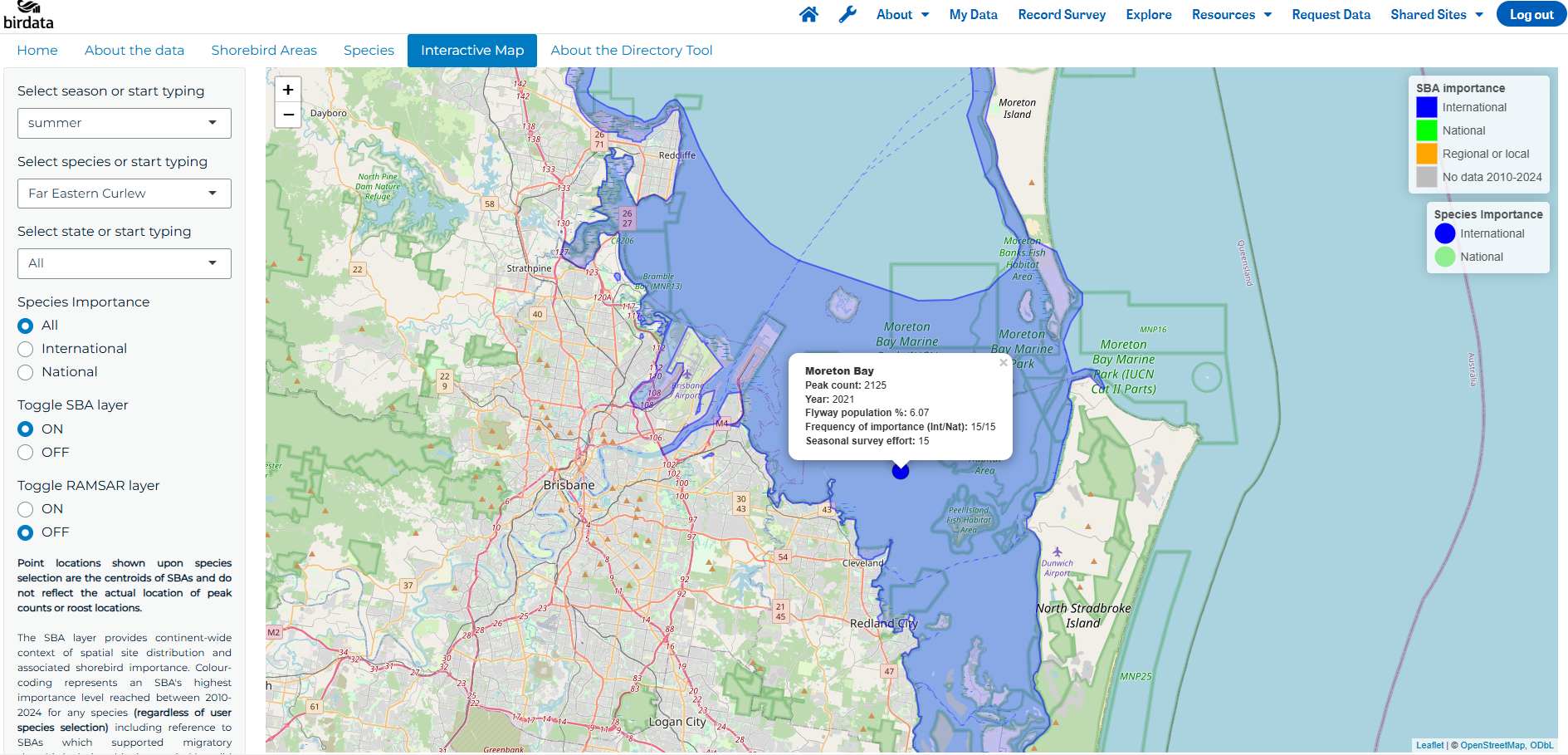 Image: Example of the online interactive Directory tool for Far Eastern Curlews in the shorebird area (SBA) of Moreton Bay. Note the point is a centroid point othe SBA and does not indicate the actual location of peak counts or roost locations. The pop-up text box for the species provides a quick overview of the species’ peak count and year it occurred, the estimated percentage of the Flyway population using the SBA, the number of years the species hit an important national or international threshold, and the number of years (over the 15 year study) surveys were conducted.